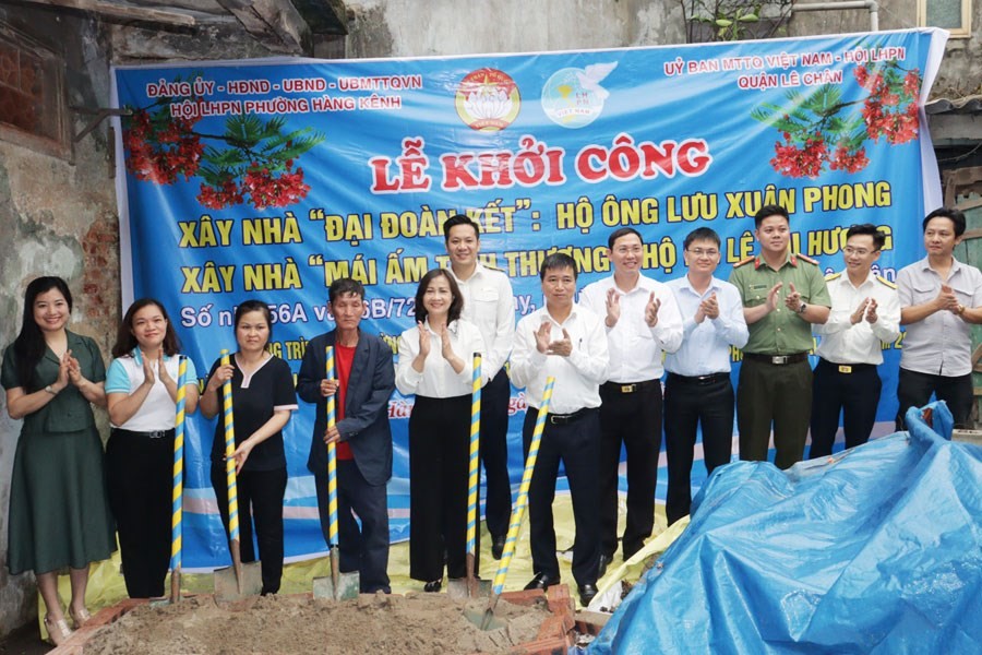 Theo đó, Ủy ban MTTQ Việt Nam phường và Hội LHPN phường đã vận động các nguồn lực, tiếp nhận kinh phí từ các tổ chức, cá nhân để tổ chức Lễ khởi công xây nhà “Đại đoàn kết” cho hộ cận nghèo là hộ ông Lưu Xuân Phong với tổng kinh phí vận động được hơn 120 triệu đồng và xây dựng nhà “Mái ấm tình thương” cho phụ nữ có hoàn cảnh khó khăn là hộ bà Lê Thị Hương với tổng kinh phí vận động được 122 triệu đồng, tại địa chỉ: 56A và 56B/72 Lạch Tray, phường Hàng Kênh, quận Lê Chân.